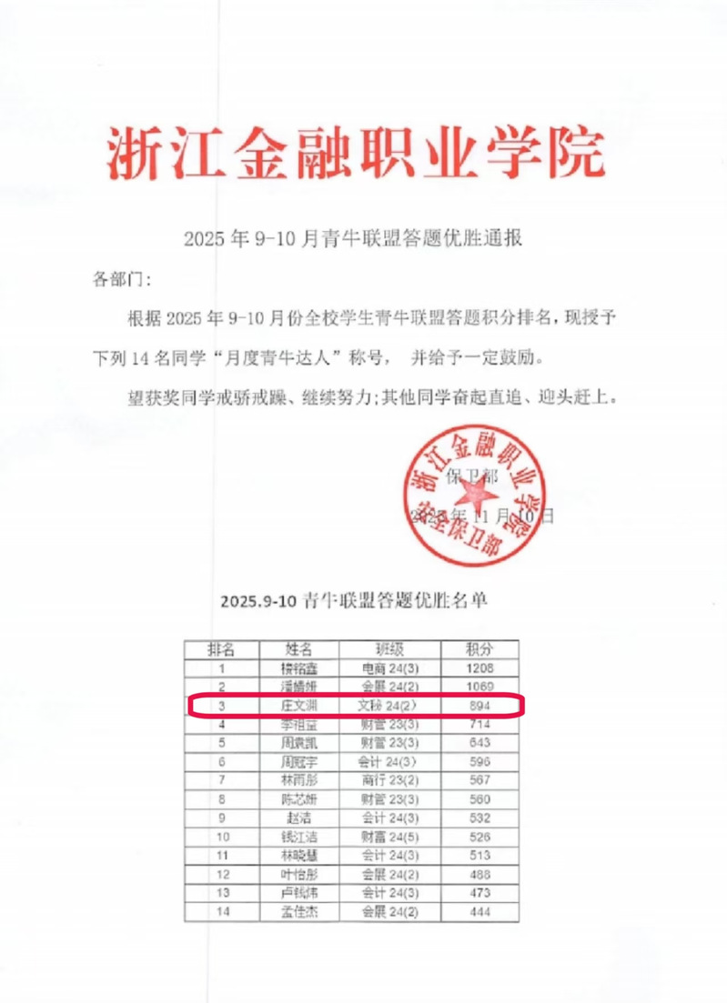 根据校保卫处《2025年9-10月青牛联盟答题优胜通报》,我院文秘242班庄文渊同学在“青牛联盟”反诈答题活动中表现优异,荣获“月度青牛达人”称号”!庄文渊同学凭借扎实的反诈知识积累,在全校答题积分榜中名列前茅,展现了人艺学子良好的安全素养与学习风貌!