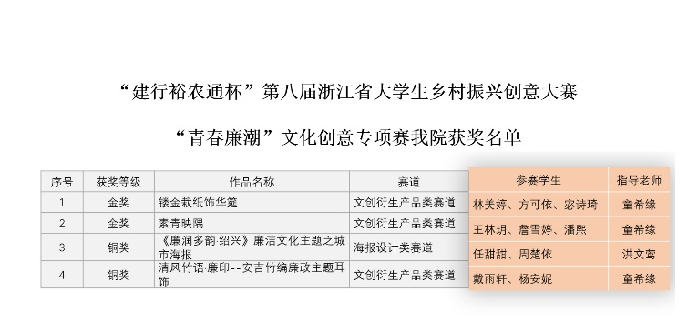 捷报频传,载誉前行!近日,“建行裕农通杯”第八届浙江省大学生乡村振兴创意大赛“青春廉潮”文化创意专项赛省级决赛圆满落幕,我院师生团队不负众望、奋勇争先,在全省众多参赛队伍中脱颖而出,斩获亮眼成绩!